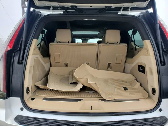 The Escalade ESV Premium's exterior is equally impressive, featuring a striking Crystal White Tricoat paint finish and stylish 22" alloy wheels. The power liftgate, puddle lamps with the Cadillac crest, and running board assist steps add both form and function to this exceptional vehicle.
