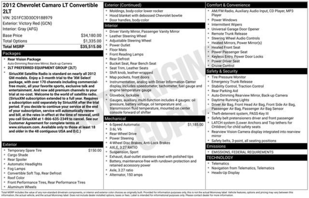 Fox Chevrolet has been delivering on a promise since 1967. Come in and check out what the Fox Advantage truly is. Same Vehicle, Same Color, Same Options- Better Value. We do the legwork for you! We use state-of-the-art software to make sure our vehicles are priced below the market. This ensures you a great value, a stress-free and fun buying experience. As part of the Fox family, all of our customers receive a Deductible Reimbursement program that could save you thousands, just ask us how! RWD 2012 Chevrolet Camaro 2LT 2LT 3.6L V6 DGI DOHC VVT