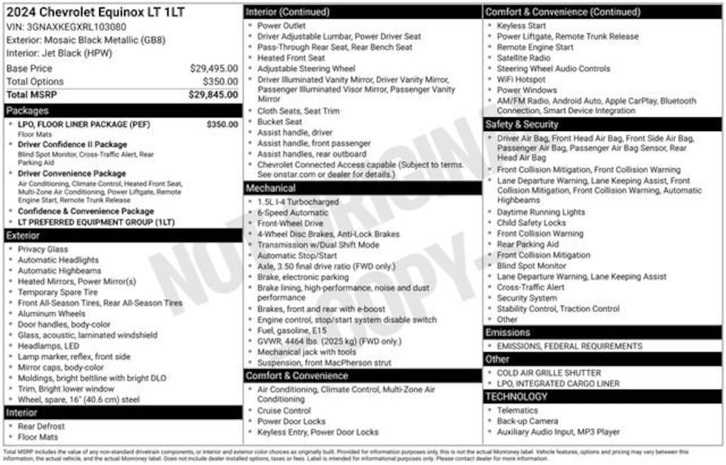 Fox Chevrolet has been delivering on a promise since 1967. Come in and check out what the Fox Advantage truly is. Same Vehicle, Same Color, Same Options- Better Value. We do the legwork for you! We use state-of-the-art software to make sure our vehicles are priced below the market. This ensures you a great value, a stress-free and fun buying experience. As part of the Fox family, all of our customers receive a Deductible Reimbursement program that could save you thousands, just ask us how! FWD 2024 Chevrolet Equinox LT 1.5L DOHC