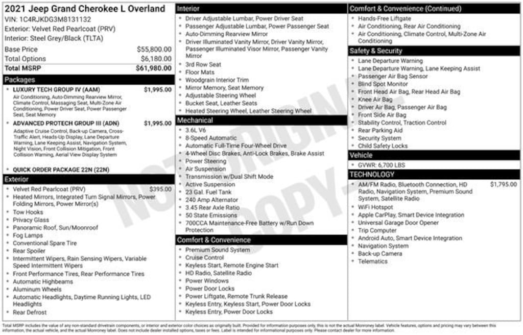 Fox Chevrolet has been delivering on a promise since 1967. Come in and check out what the Fox Advantage truly is. Same Vehicle, Same Color, Same Options- Better Value. We do the legwork for you! We use state-of-the-art software to make sure our vehicles are priced below the market. This ensures you a great value, a stress-free and fun buying experience. As part of the Fox family, all of our customers receive a Deductible Reimbursement program that could save you thousands, just ask us how! 4WD 2021 Jeep Grand Cherokee L Overland 3.6L V6 24V VVT